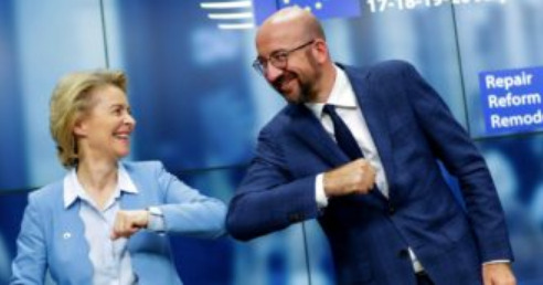 Datevi la mano e poi disinfettatevela invece di fare questa scena ridicola: senza mascherina si alitano in faccia a meno di un metro di distanza, fosse anche solo per il tempo necessario toccarsi i gomiti.
